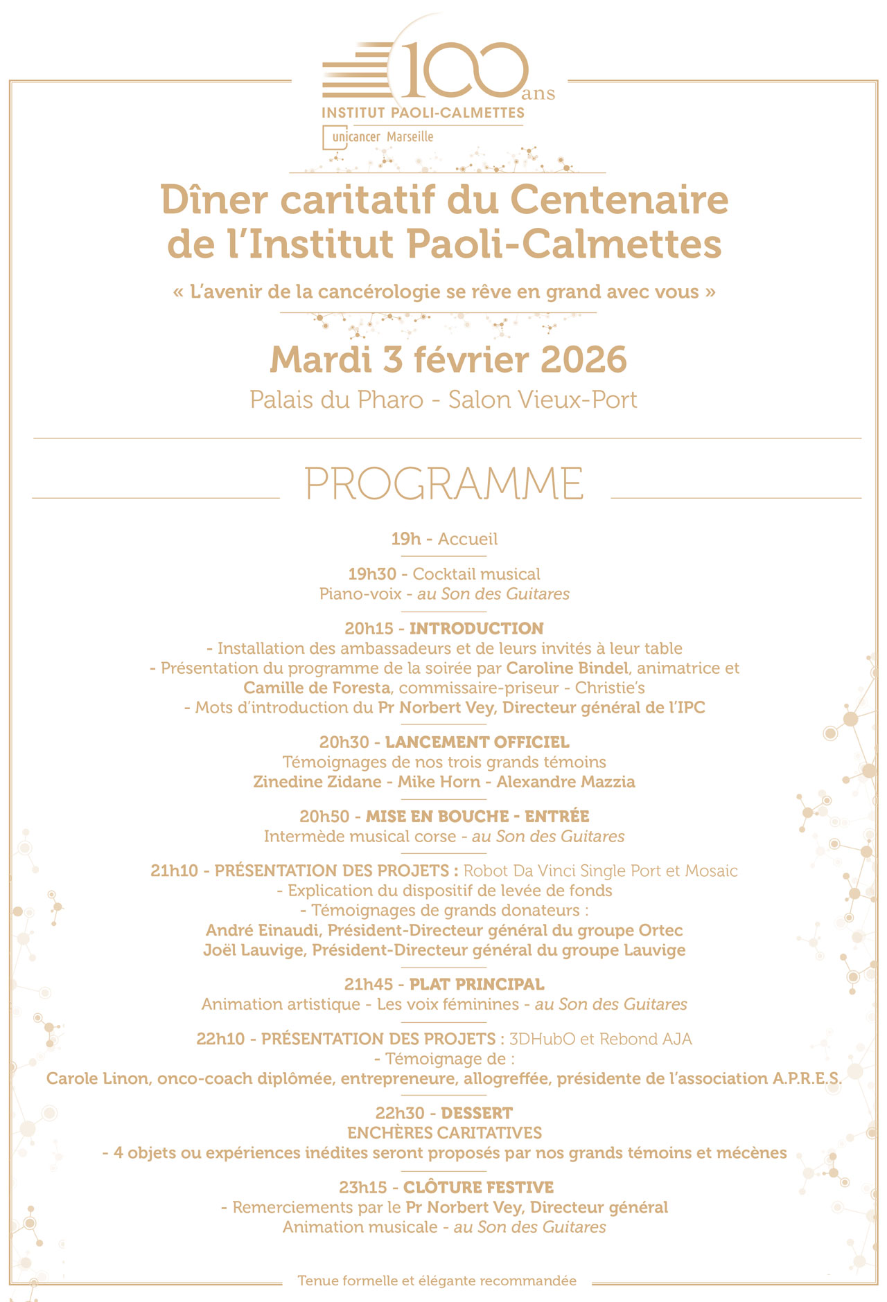 Ce dîner caritatif réunira des personnalités emblématiques telles que Zinedine Zidane et Mike Horn, et le Chef Alexandre Mazzia. Ensemble, nous soutiendrons quatre projets inédits portés par l’IPC avec du diagnostic, de l’accompagnement, du soin et de la recherche, pour imaginer l’avenir de la cancérologie et accélérer l’innovation au bénéfice de tous.